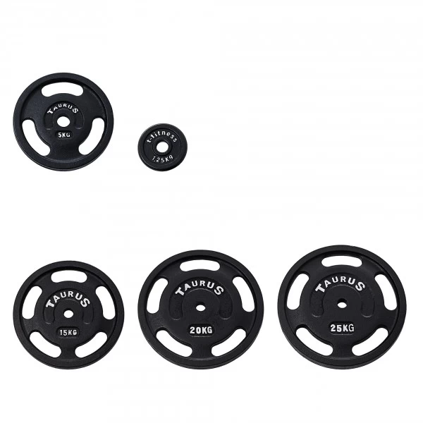 Gli Taurus Disco 3G 30 mm in Ghisa rotondo con apertura da presa sono in vendita nelle classi di peso 2,5 kg, 5 kg, 10 kg, 15 kg, 20 kg e 25 kg. Per via della misura minimale i pesi da 0,5 kg e 1,25 kg dei dischi in ghisa non sono dotati di aperture da presa.