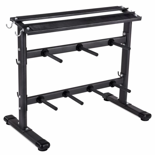 Il Taurus Supporto per Manubri e Dischi è un deposito versatile e robusto per numerosi utensili d’allenamento. Su questo supporto combinato potete conservare contemporaneamente i manubri compatti, i manubri corti, i dischi da 30mm e le barre bilanciere. La disposizione dello spazio di conservazione offre molto posto agli utensili per l’allenamento muscolare in confronto ad una superficie con meno spazio.